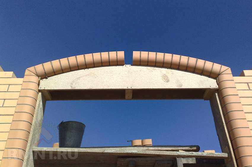 Когда все параметры станут известными, проводится монтаж деревянного эскиза, после чего следует непосредственно кирпичная кладка. Распределение кирпичиков выполняется снизу, при этом кладка осуществляется по обеим сторонам будущей арки. Чтобы не нарушать расстояние между опорами, кладется доска нужной длины, которая держится на столбах и перемещается по мере их увеличения. После необходимо установить брус по обеим сторонам конструкции, который будет служить подпоркой.