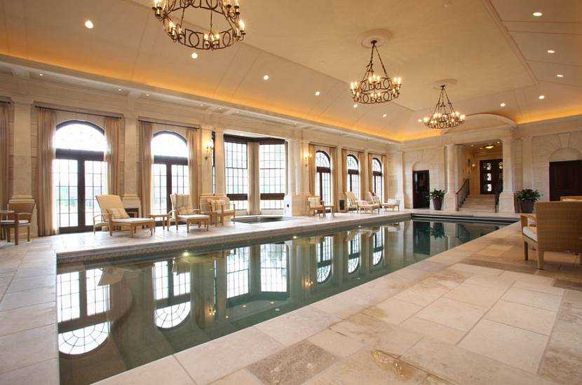 Бассейн, расположенный внутри помещения, требует дополнительных затрат, но зато и предполагает ряд преимуществ.