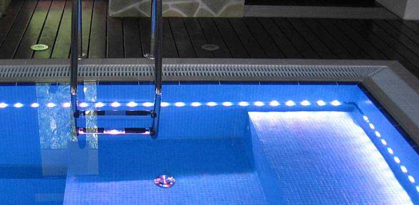 Контурное освещение монтируют по верху краев бассейнов. Специальные светильники используются для подводной иллюминации, в том числе для разноцветной подсветки воды. Приборы производят из нержавеющего металла, прочного пластика и закаленного стекла.