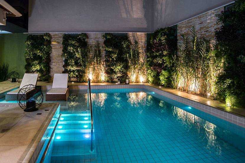 Большую роль в интерьере бассейнов в частных домах играет освещение, которое используется для создания интересных эффектов и уютной атмосферы. В помещении, предназначенном для домашнего бассейна, можно установить влагозащитные люстры со светодиодами и галогенными лампами.