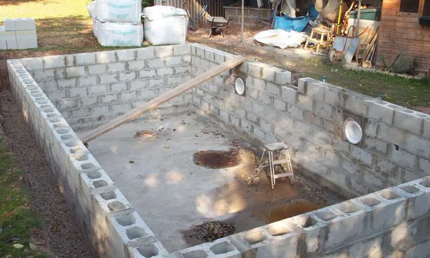 Итак, чтобы самостоятельно построить бассейн, придётся довольно много потрудиться: выкопать котлован, разместить гидроизиоляцию, подготовить опалубку по контуру, залить бетоном.
