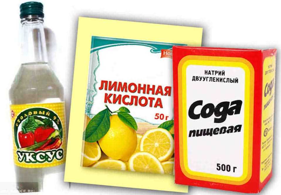 Активно используется соединение соды, лимонной кислоты и уксуса, в результате чего получается универсальное чистящее средство, способное легко убрать грязь, гниль, известь и ржавчину. Для приготовления состава в подходящую емкость наливают 1,5 л теплой воды, выдавливают сок из половинки лимона, добавляют 1/2 стакана соды, 50 мл 9% уксуса.