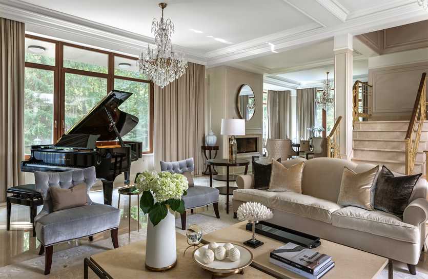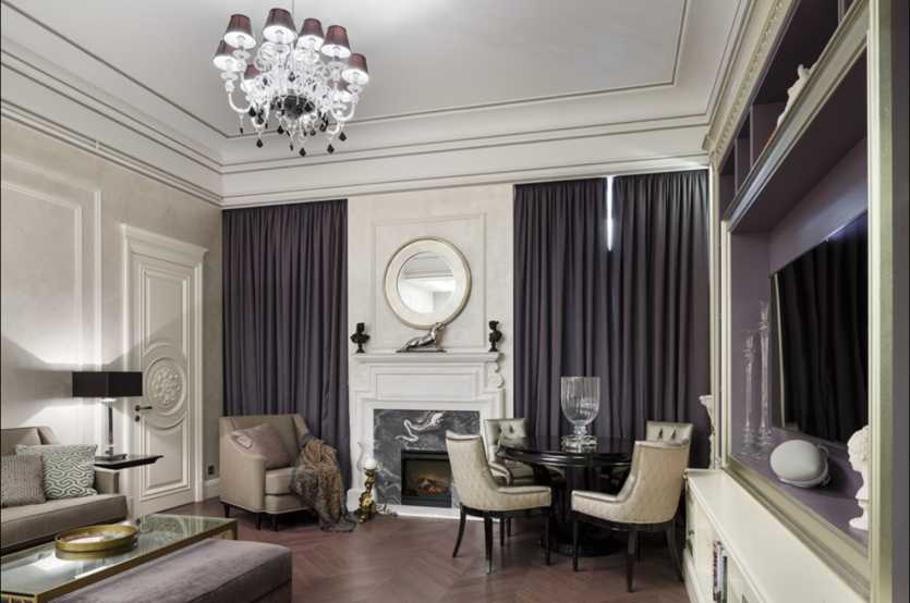 Классический дизайн гостиной требует соблюдения стиля при выборе предметов интерьера. Барокко, рококо, викторианский, ренессанс отличаются рельефной лепниной с позолотой и сложным растительным орнаментом. Витые пилястры, резные портики и венцы из полиуретанового молдинга стилизованного под гипс, мрамор или дерево используют, как фальш-панели для встроенного или заглубленного электрокамина. Его форма должна соответствовать классическим канонам – прямоугольный портал с открытой топкой (фото).