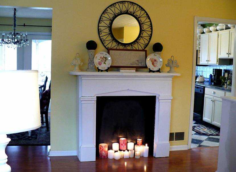 В интерьере гостиной с камином часто используют фальш-модели. Имитации внешне похожи на полноценные очаги. Электрический вариант не только украшает, но и обогревает комнату. Во время работы устройство издает звуки горящих поленьев. Вместо огня можно использовать свечи или визуализацию на экране.