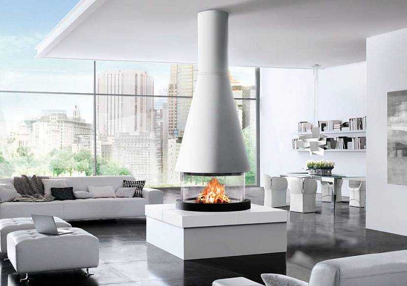 Островные камины – редкость и смотрятся весьма интересно. Подобный выбор подходит только для просторных комнат. Теплоотдача у них меньше, чем у моделей, описанных выше. Островные камины часто выполняют только декоративную роль. У них очаг просматривается со всех сторон, поэтому зону для отдыха можно располагать по кругу.