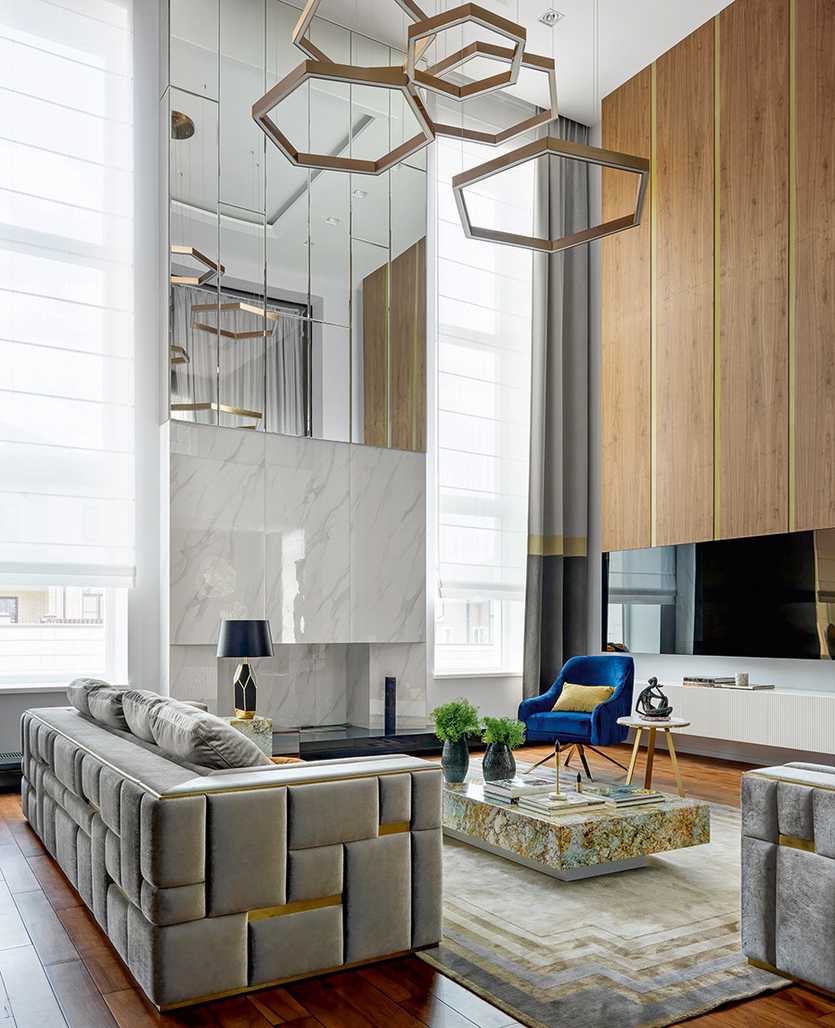Еще одна дизайнерская хитрость для визуального увеличения пространства – правильная расстановка светильников. Сделайте акцент над зоной, где установлен камин. Не довольствуйтесь лишь одной большой люстрой, а установите несколько источников света в разных частях комнаты. Если потолки многоуровневые, то монтируйте светильники на разной высоте, такой ход сделает гостиную еще более эффектной.