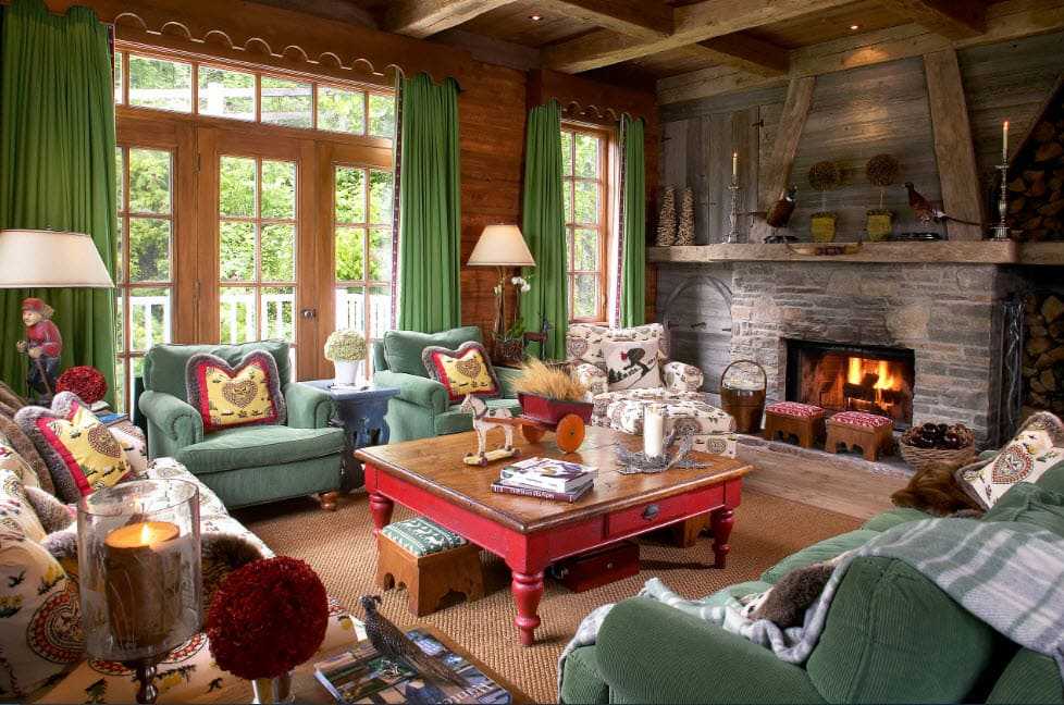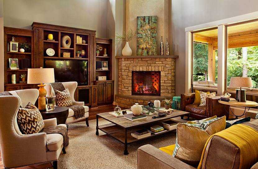 Стиль рустик, прованс, кантри в оформлении гостиной подчеркнет небольшой или средний камин с Д-образным порталом. Основная цель этого направления – создание комфортной обстановки в сочетании с функциональной естественностью. Пристенный, угловой или заглубленный очаг оформляют необработанным деревом, песчаником, ракушечником. Для облегчения работ используют фальш-панели, имитирующие природные материалы.