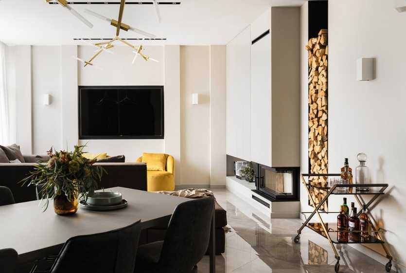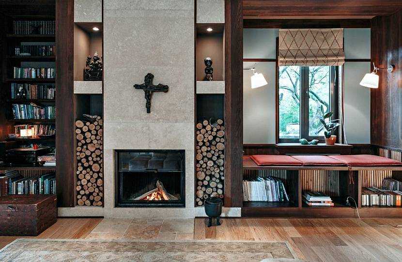 Важно учитывать и наличие составных элементов топки, обращать внимание на то, как выглядит дымосборник, дымоход, есть ли у камина встроенный дровник. В продаже есть модели со специальной полкой для дров. Она обязательно должна быть обыграна в оформлении комнаты