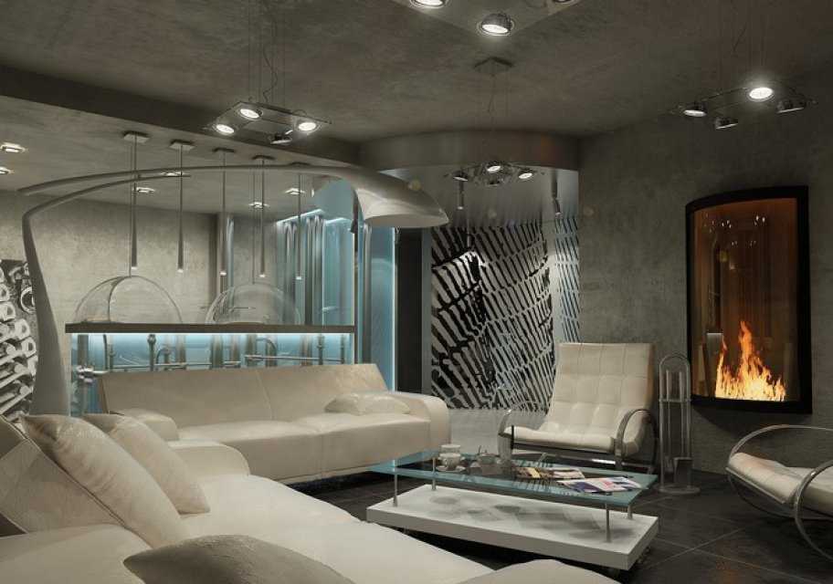 Бионика – относительно новое дизайнерское направление отличается отсутствием углов и ровных линий в интерьере гостиных. Природному стилю присущи плавные изгибы натуральных материалов в оформлении перегородок, проемов, мебели, которые копируют объекты живой природы. Выпирающий из стены ствол дерева, застывший каменный поток, повисшая в пространстве прозрачная капля, – естественное обрамление очага в стиле бионика (фото).