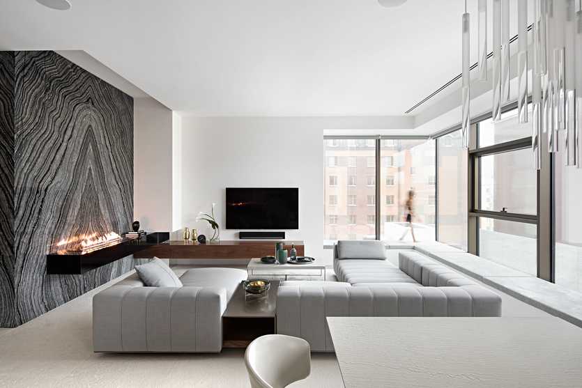 Камин под телевизором в гостиной (взгляните на фото ниже) часто помогает четче обозначить смысловой центр комнаты, привлекает внимание к лаунж-пространству — и при этом делает «черный экран» менее заметным. Кроме того, такой вариант — отличный выбор для небольших комнат, где чрезмерное дробление на зоны попросту бессмысленно