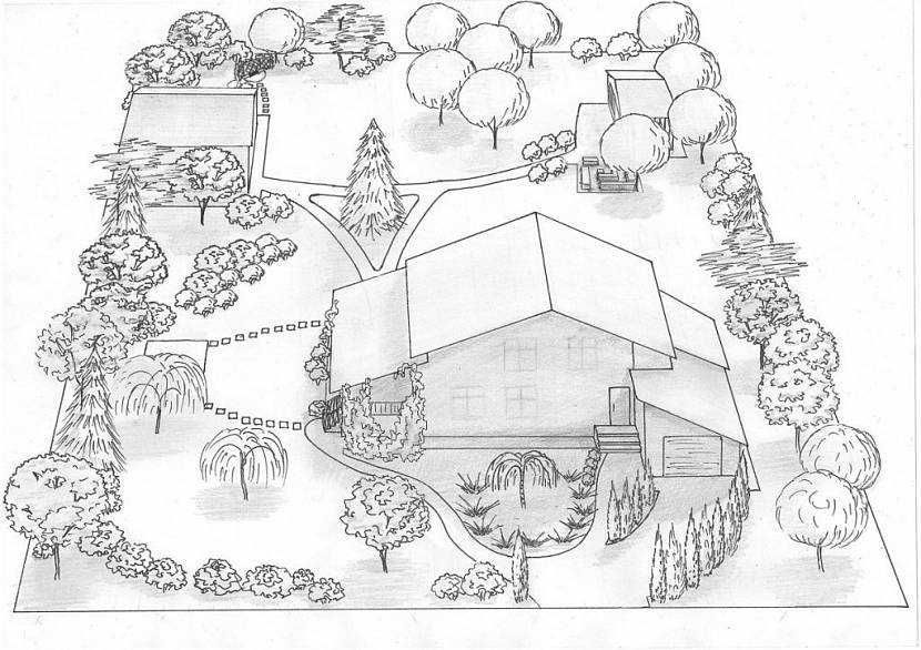 - Для начала в план вносится дом, а также иные важные постройки (гараж, к примеру), которые имеются на участке. Месторасположение должно быть на рисунке максимально точным, чтобы впоследствии воссоздать все конструкции на земле. Все постройки соединяются между собой линиями, не забыв при этом сделать путь к калитке. Эти линии будут считаться за обязательные.