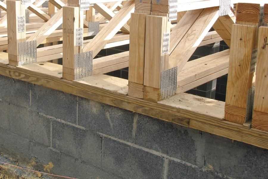 Для устройства крыши необходимы деревянные балки, концы которых обрабатывают гидроизоляционными составами и заводят на стены более чем на 15 см, под балку подкладывают доску. Можно также вмуровать балки в стену, предварительно обернув концы толем.