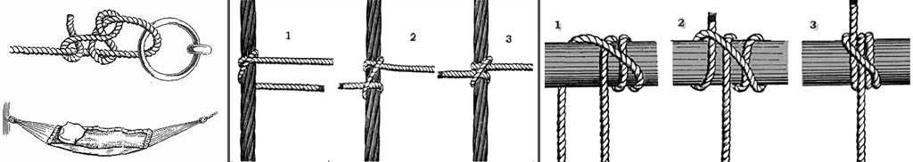 К рыму или коушу расчалку привязывают коечным узлом, слева на рис. К опоре не очень толстой, примерно с руку взрослого мужчины или тоньше – узлом выбленочным, в центре. На толстой опоре надежнее будет узел задвижной штык, справа.