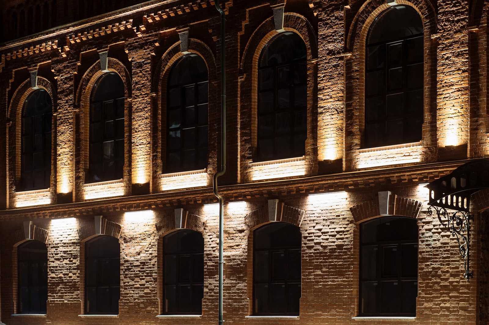 Мы использовали прием статического акцентного освещения, чтобы легкими штрихами подчеркнуть архитектурные особенности здания. По желанию заказчика светотехническое оборудование выкрасили в цвет красного кирпича – под стать историческим фасадам, чтобы не «загрязнять» их в дневное время», –