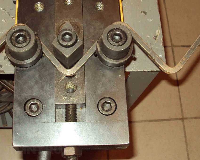 К станине сбоку приваривается или прикручивается болтами, что гораздо удобнее, стальной клин. На боковых стойках рамы закрепляются на одном уровне по горизонтали два валика. Теперь, вращая винт, вы сможете опустить или поднять станину с клином, который будет увеличивать или ослаблять давление на уложенный между ним и валиками пруток. Съемный клин для гнутика, с несколькими дополнительными насадками разной формы, позволит вам менять угол сгиба металлической заготовки.