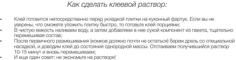 После нанесения разметки нужно сделать своими руками клеевой раствор. Если смесь приготовить неверно, с нарушениями рекомендаций производителя, то она очень быстро разрушится и фартук отпадет.