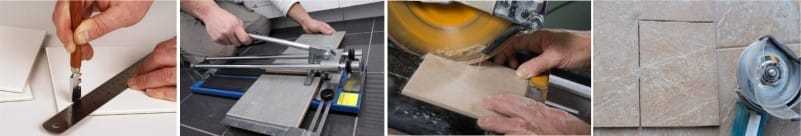 Плитка при подгонке режется ручным плиткорезом, который прост в использовании и не требует специальных навыков. Отверстия в кафеле сверлятся корончатыми свёрлами или инструментом, называемым «балеринкой».