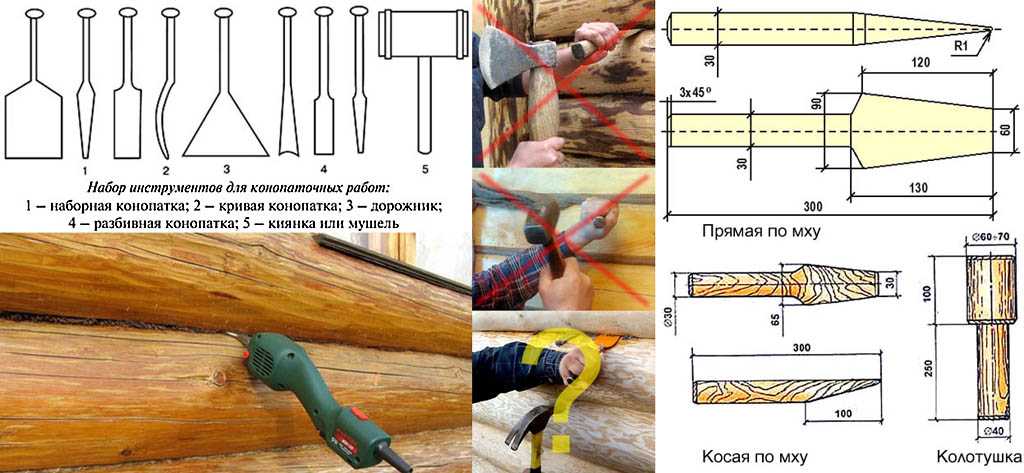 Специалисты рекомендуют использовать конопатки из дерева, поскольку это защищает сруб от появления повреждений. Лезвия инструментов не должны иметь зазубрин, поскольку они цепляют материал и вытягивают его обратно.