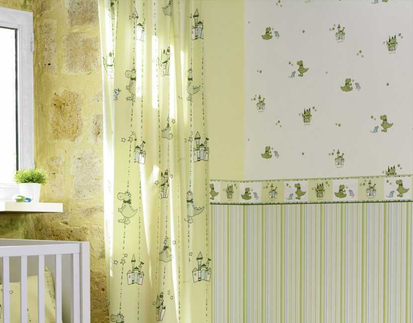 - 1/3 нижней части оформляют листами в полоску, в верхней части используются материалы с мелким рисунком или однотонные;