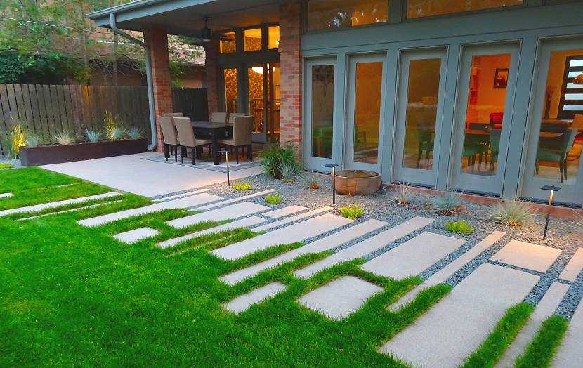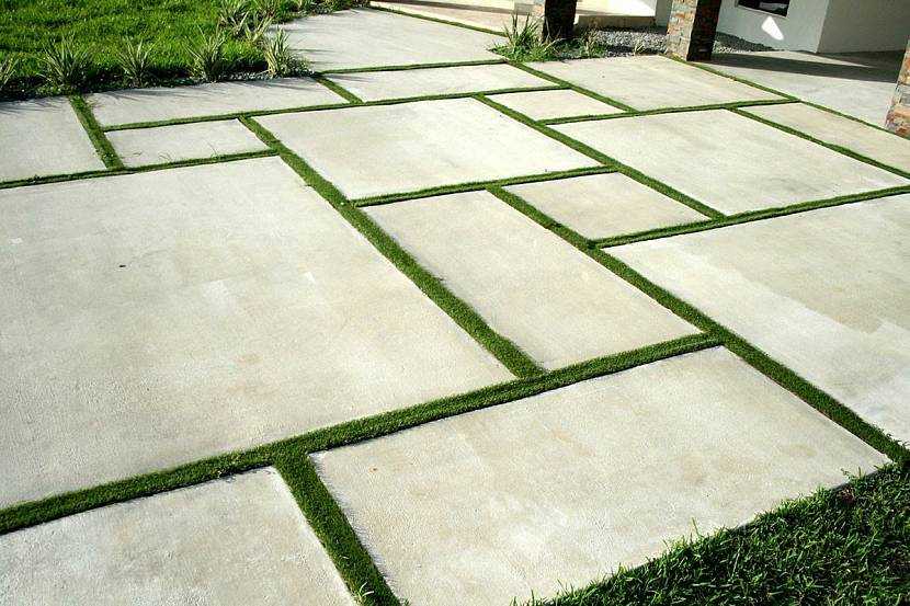 Очень красиво смотрятся бетонные плиты, уложенные с большими зазорами, которые засевают газонной травой.