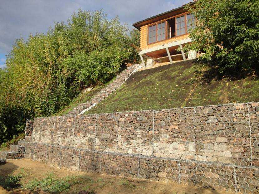 Все это удерживает грунт, не дает ему осыпаться. Еще нужна качественная дренажная система, которая будет отводить осадки от здания на безопасное расстояние.