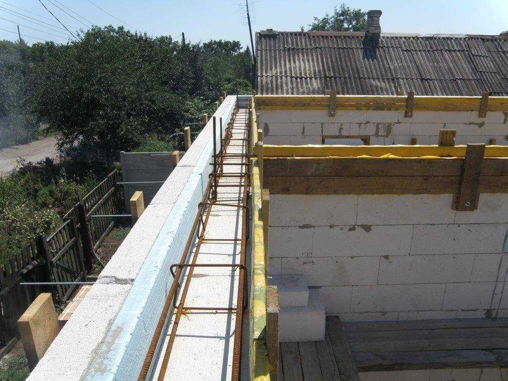 Все технологические особенности возведения данного пояса аналогичны межэтажному поясу. Когда монтаж плит не намечается, то пояс устанавливают по границам внешних стен, если стропильная конструкция наклонная, то не будет лишним установить пояс на среднюю несущую стену.