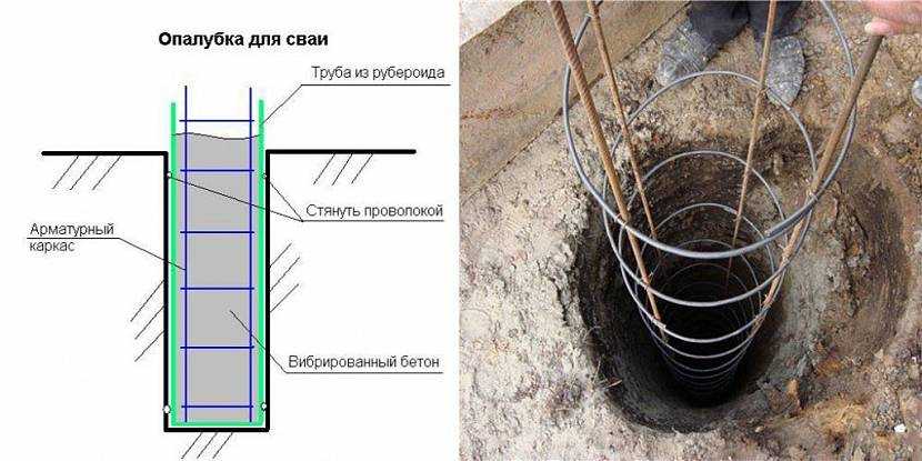 Расстояние между опорами определяют по формуле I = P/Q, где Р — несущая способность сваи (п.5), R — погонная нагрузка на ростверк (п.4). Количество свай определяют исходя из расчетного расстояния между опорами и размеров строения. Армируют конструкции вертикальным каркасом из не менее, чем 4 стержней диаметром от 10 до 16 мм с горизонтальной обвязкой из гладкой арматуры Ø 6-8 мм. По верху оставляют выпуски длиной 25-30 см.