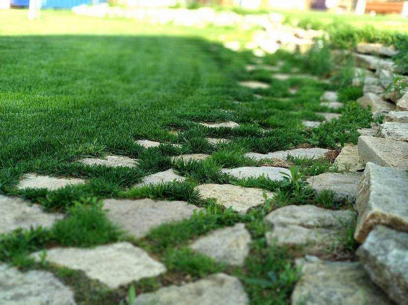 Садовые дорожки с природным камнем на травянистой местностиИсточник landshaftnyy-dizayn-18.ru