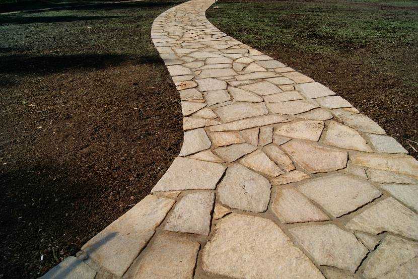 При создании дорожек, предназначенных для пешеходных прогулок, можно экономить и выбирать для мощения желтый песчаник. У него шершавая зернистая поверхность, приятная на ощупь. По ней приятно ходить босиком. Материал перед укладкой шлифовать нельзя (слишком мягкая у него структура). Но прочность материал имеет хорошую, поэтому дорожки из желтого песчаника прослужат достаточно долго.