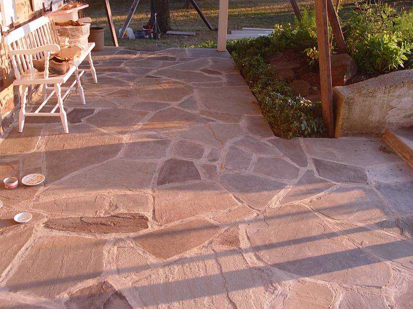 Плита из него в один квадратный метр способна выдержать вес в одну тонну. Натуральный камень имеет неоднородный окрас, в его структуре обязательно присутствуют расплывчатые вкрапления, у которых нет четких границ. Неровные края, наличие грубых заусенцев, рельефная фактура – характеристики, свидетельствующие о природном происхождении. У искусственных аналогов таких дефектов нет. Их наличие усложняет мощение. Но при знании технологии укладки, можно решать любые, даже самые сложные задачи.