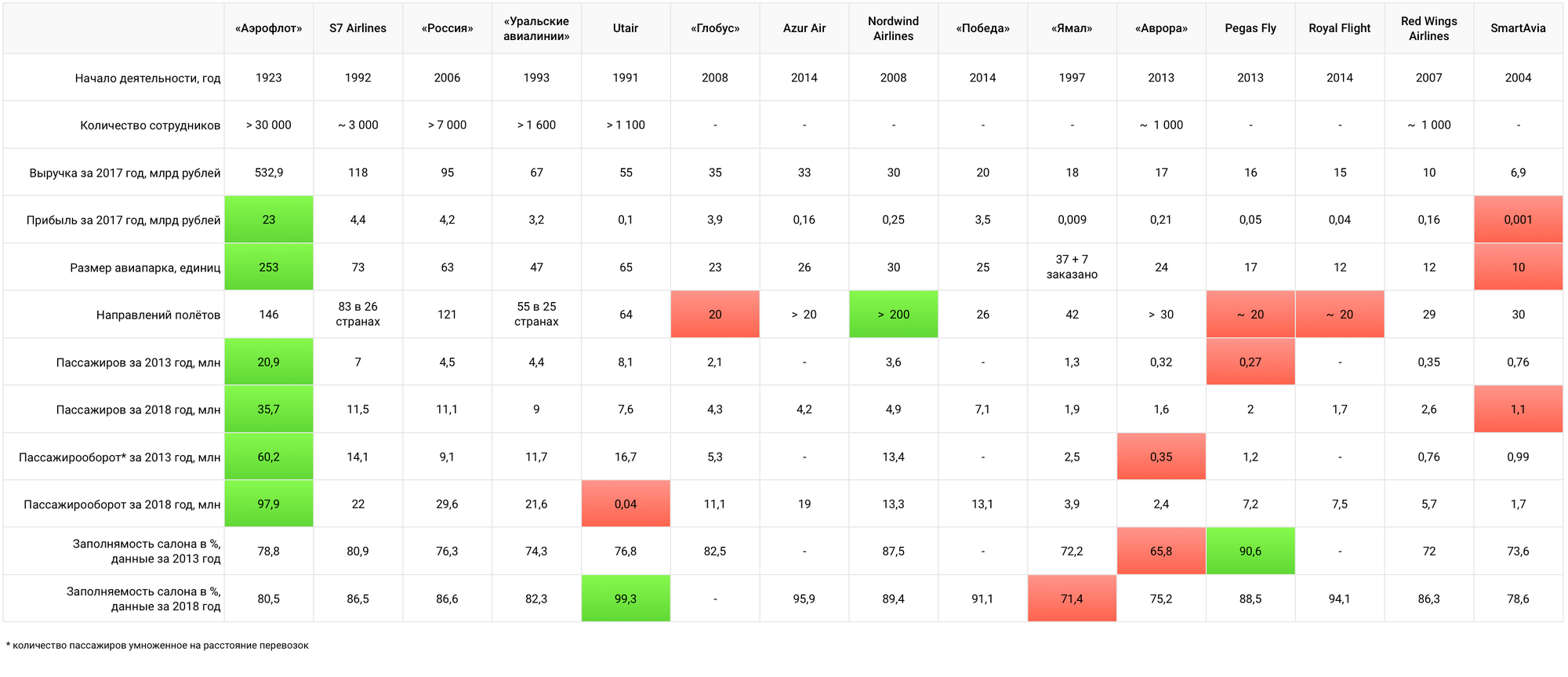 Главными перевозчиками России за 2017 год, обслуживающими более 70% всего рынка, являются авиакомпании «Аэрофлот», S7, «Россия», UTair и «Уральские авиалинии».