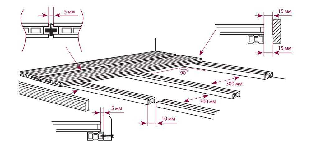 | Расстояние между террасной доской дпк, при продольной стыковке | мм | 5-10 | Расчет расстояния между торцами доски: