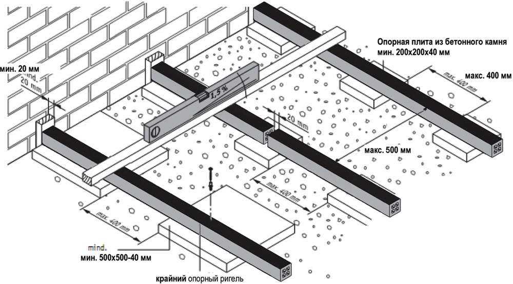 | Рекомендованный уклон террасы, в направлении от здания | % | 1-3 | Уклон основания 1 см / 1 м.п. |