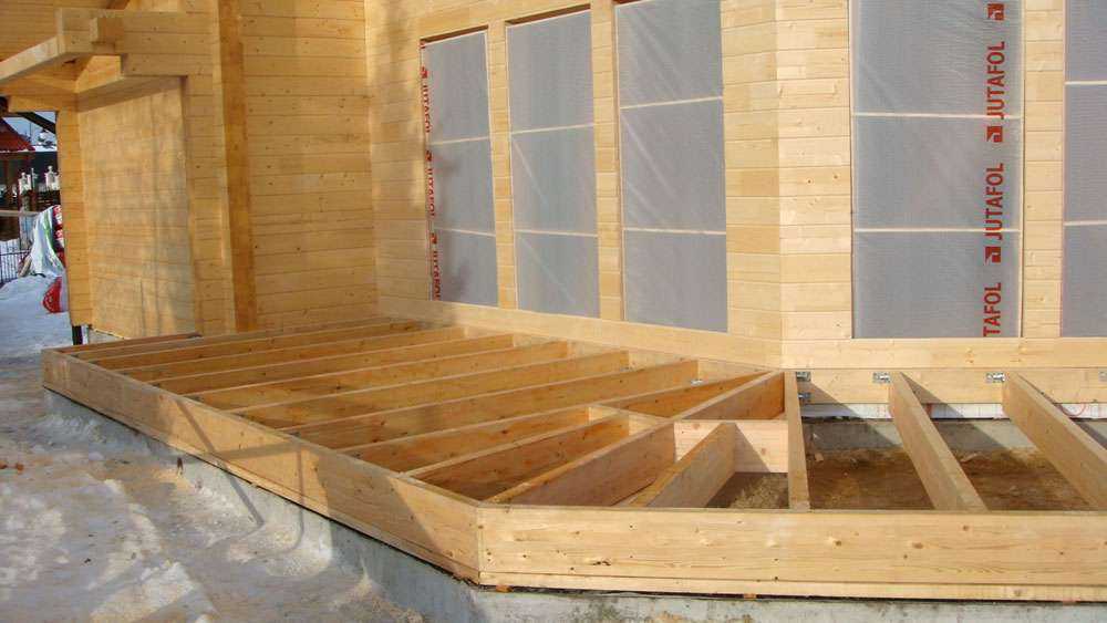Основание, на которое будем укладывать лаги, следует выровнять и заложить уклон 2-3 градуса. Обычно это бетонное основание, сверху засыпанное слоем щебня. Затем монтируем лаги. Если требуется, то поднимаем на высоту фундамента дома, чтобы получить продолжение дома.
