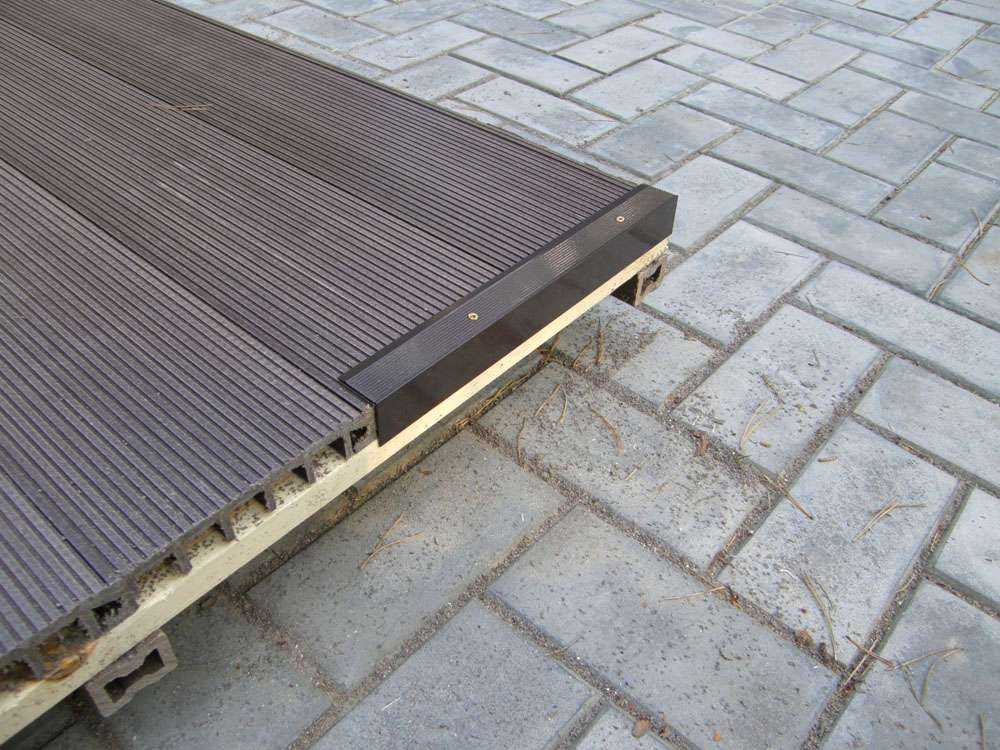 В процессе монтажа, выступающие торцы досок не подрезаются. После завершения работ, очерчивается рабочий контур, лишние части подпиливаются болгаркой. Затем выполняется финишная отделка: устанавливаются торцевые планки или композитные уголки, которые сцепляют края досок и придают конструкции завершённый вид.
