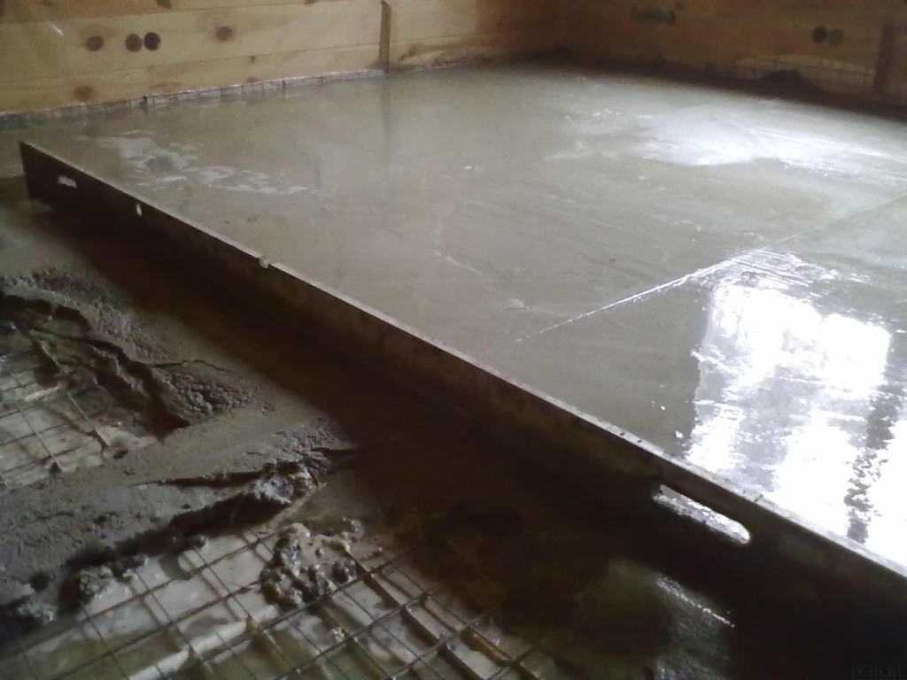 - Подготовленным ранее раствором заливается основание и равномерно распределяется по всему полу.