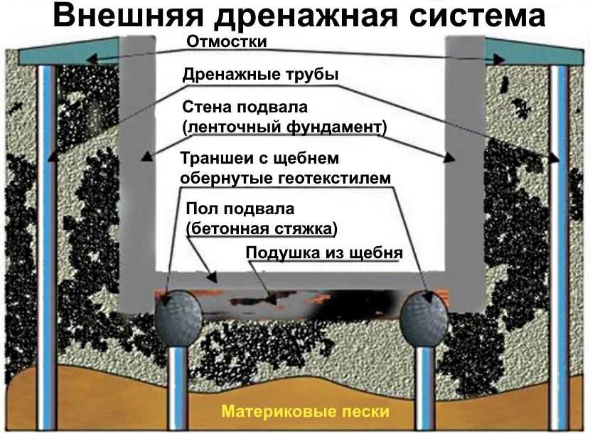 - внешний дренаж – располагается по окружности здания и включает в себя траншеи, трубы, для направления воды в скважину.