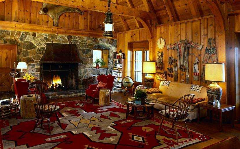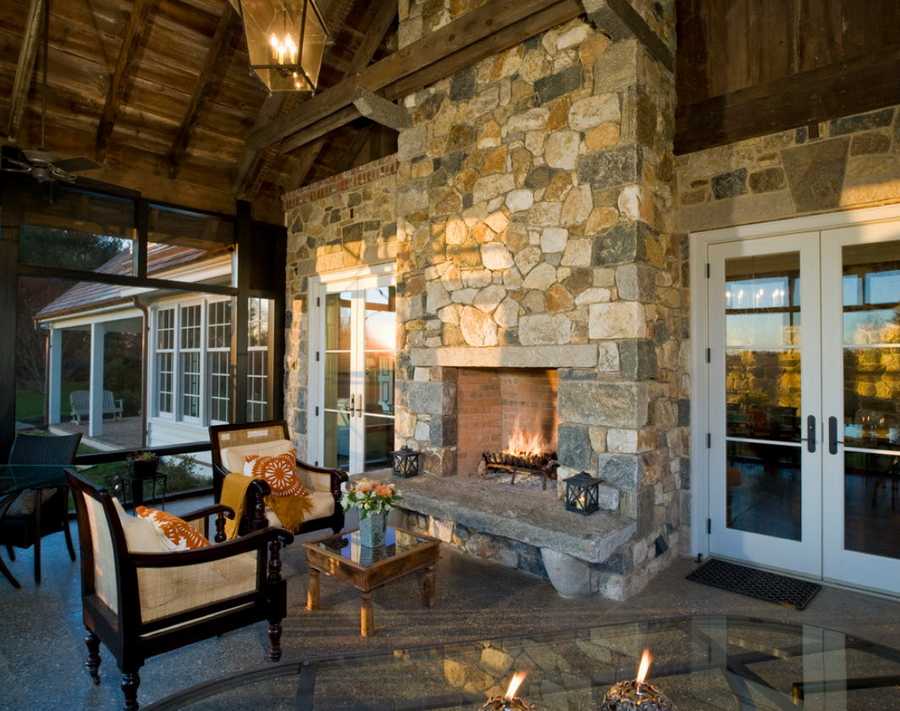 В доме, сделанном из бревна или бруса, органично будет смотреться камин в стиле кантри. Облицовка из натурального камня будет служить отличным дополнением стиля загородной жизни.