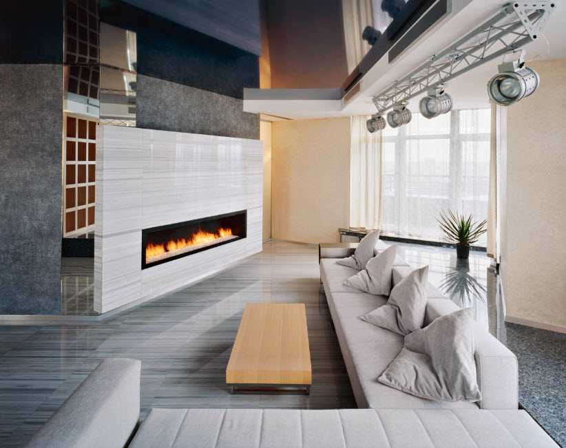 Современным камином в интерьере можно визуально исправить помещение. В узкой гостиной поперечная стена из стекла с ложным очагом у основания проводит границу между функциональными зонами. Разделенная комната не теряет первоначальной целостности.