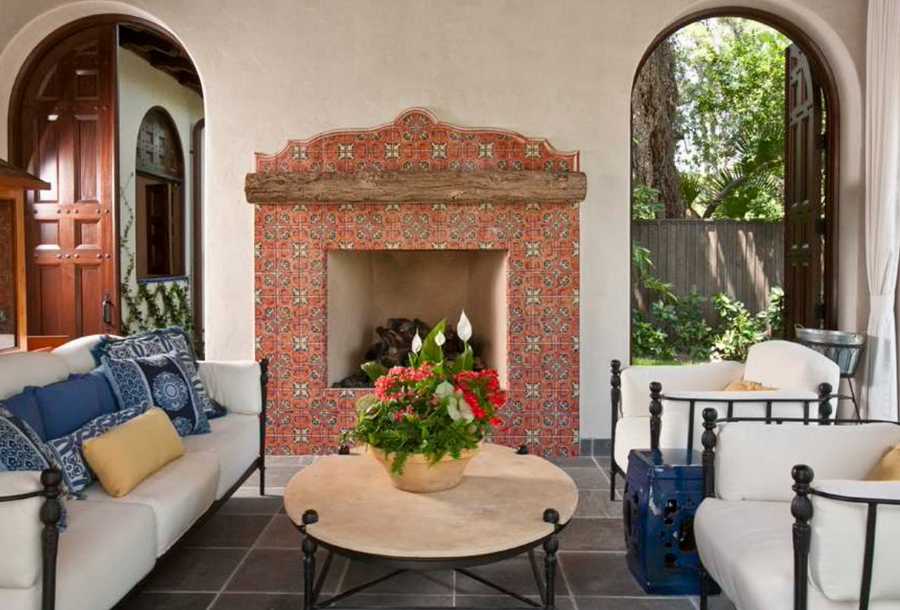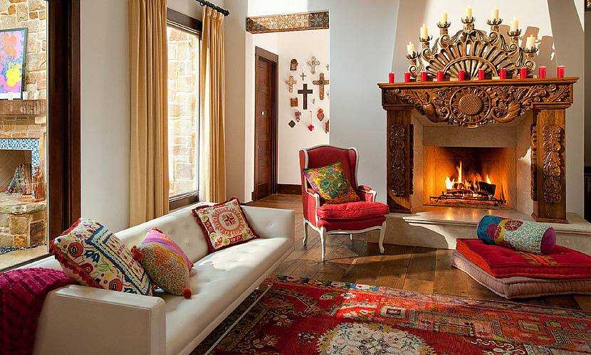 Интерьер гостиной с камином в индийском стиле оформлен в ярких цветах. В качестве материалов отделки очага используют объемные изразцы с растительным узором. Портал покрывают охрой или декоративной штукатуркой. Если комната большая, то в ней найдется место для решения с колоннами, гипсовыми картинами и фресками.