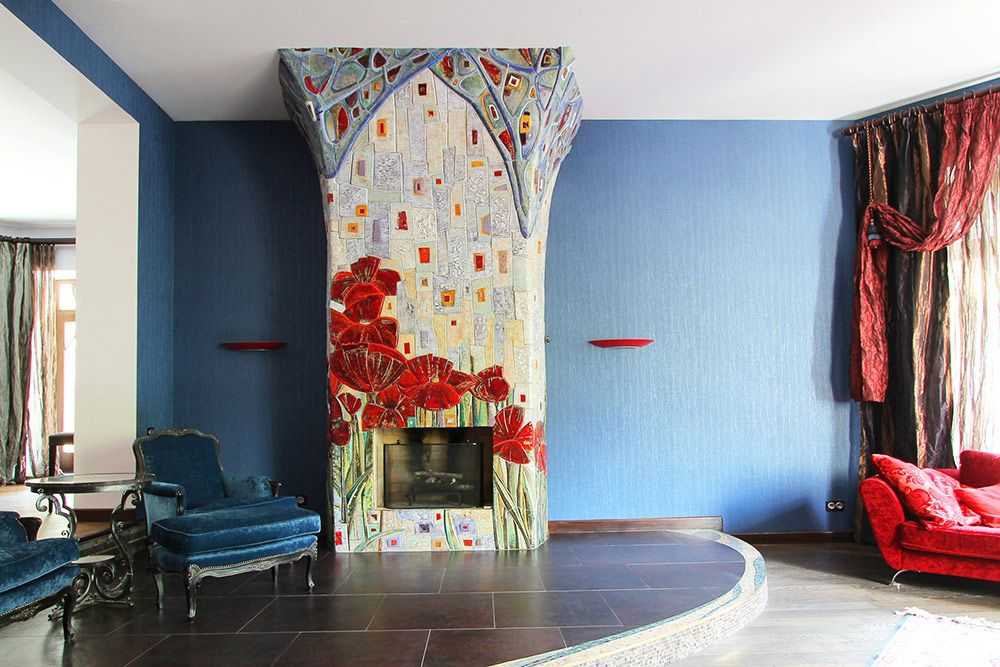 «Камин «Маки» — это современный арт-объект. Цветовое решение смелое, яркое, и при этом камин органично вписан в интерьер. Цветовой баланс уравновешен тоном стен и текстилем. Композиционно камин занимает ведущее место, но при этом не является однозначной доминантой интерьера. Отделка камина выполнена в неординарной технике изготовления керамики. Профессионализм, зрелость и новаторство художника явно видны как в образе объекта, так и в его подаче».
