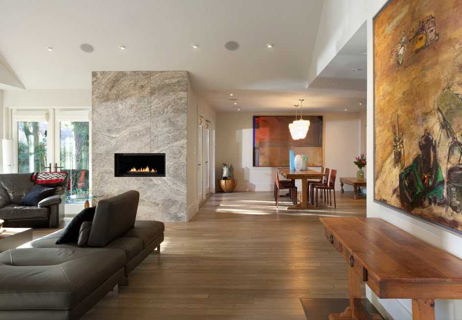 Форма и размещение камина зависит от концепции дизайнера. В объединенной гостиной и столовой конструкция в фальшивой перегородке поможет зонированию. Варианты в прозрачной стене привносят в комнату фантастические нотки.