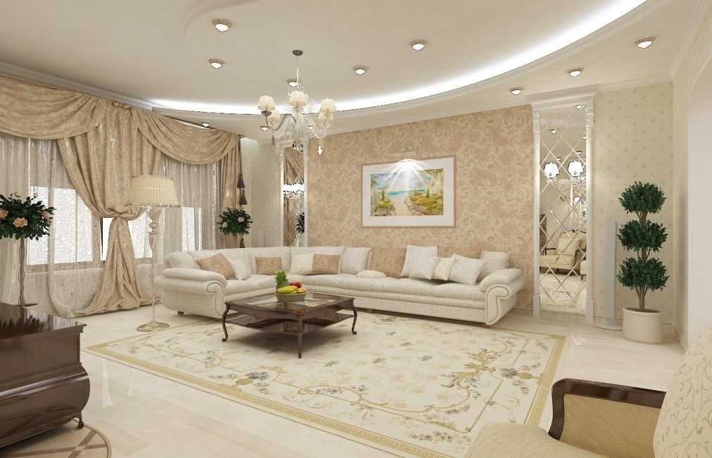 - создание акцентов на особенностях стилевого оформления зала (яркие оттенки помогают подчеркнуть динамизм пространства, а более мягкие, как на фото ниже, способствуют созданию повышенного комфорта в интерьере);