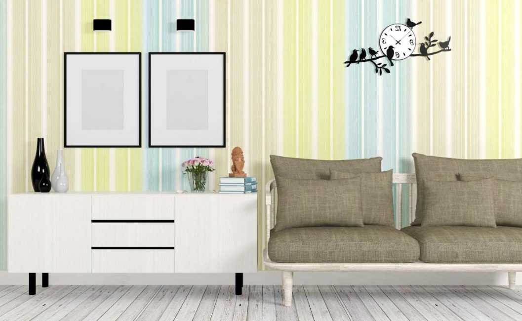 В просторном помещении можно оклеить листами с вертикальными линиями разные стены, интервал между линями может быть одинаковым либо разного размера. Полосы отличаются оттенками либо графическим оформлением
