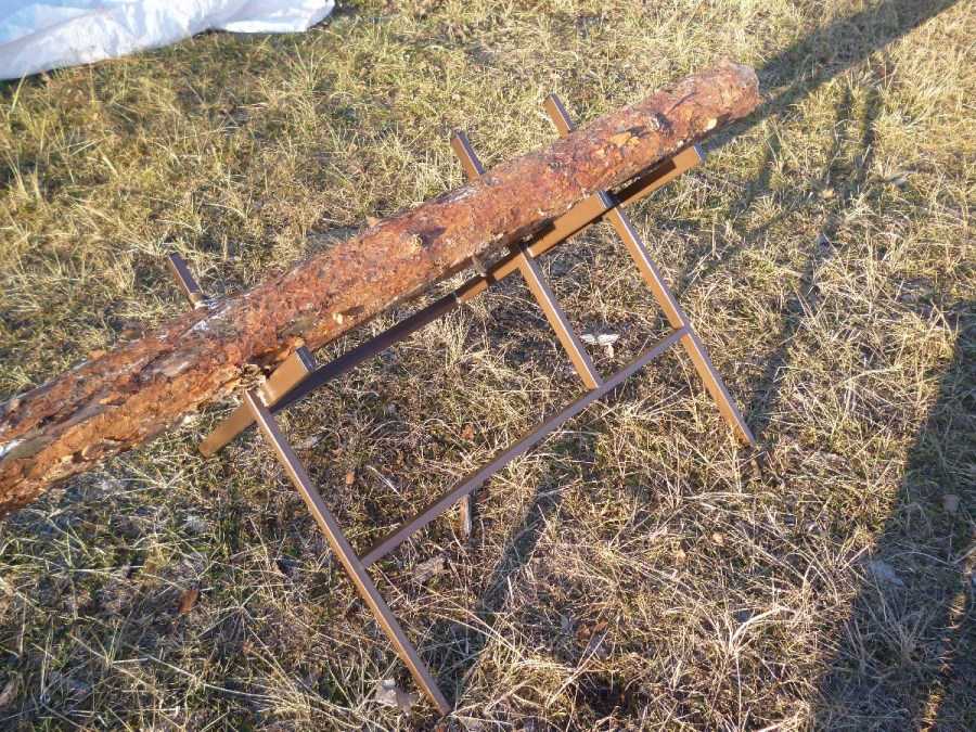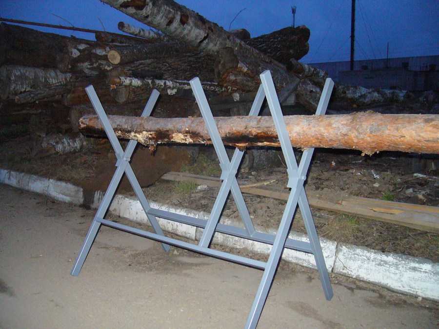 Если вы занимаетесь заготовкой тонких бревен, то лучше соорудить стойку для бревен. Конструкция представляет собой 4 ножки или столба, приваренных или прикрепленных к основанию. Для него можно использовать сварную раму или тяжелую металлическую пластину. Устройство удобно только для работы с небольшими стволами, разделкой больших бревен на нем не займешься. Размер козел выбирают исходя из размера печи и длины поставляемых бревен. Изделие можно изготовить практически любого размера.