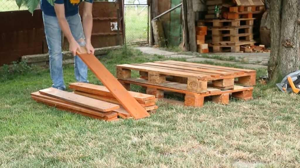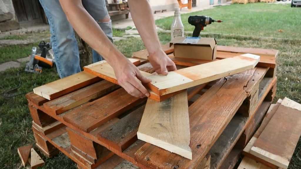 Оригинальная и простая идея: кресло из поддонов. Понадобится одна паллета, брус для ножек, подлокотников и боковые стяжки.