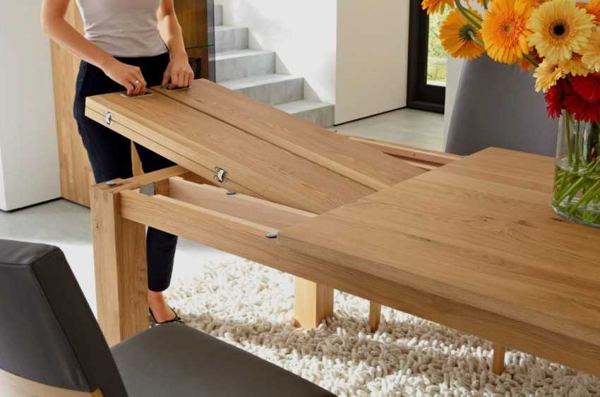 У столов с механизмом есть два минуса: они тяжелые и видны стыки, что скажется на эстетике. Если семья большая, а кухня небольшого размера – этот вариант подойдет идеально. Несмотря на то, что видны стыки, всегда можно подобрать конструкцию, которая удачно впишется в дизайн помещения.