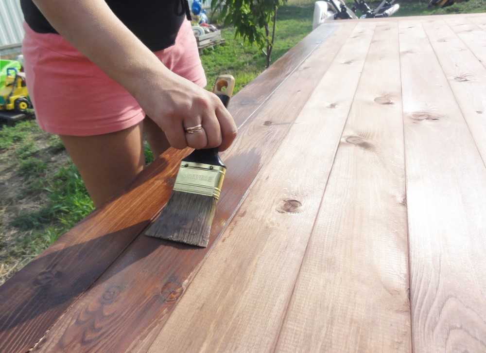Во всей конструкции шлифуются неровности, при помощи шпаклёвки скрываются допущенные ошибки. Для продления срока службы собственноручно собранного стола необходимо покрыть его несколькими слоями лака либо морилки.