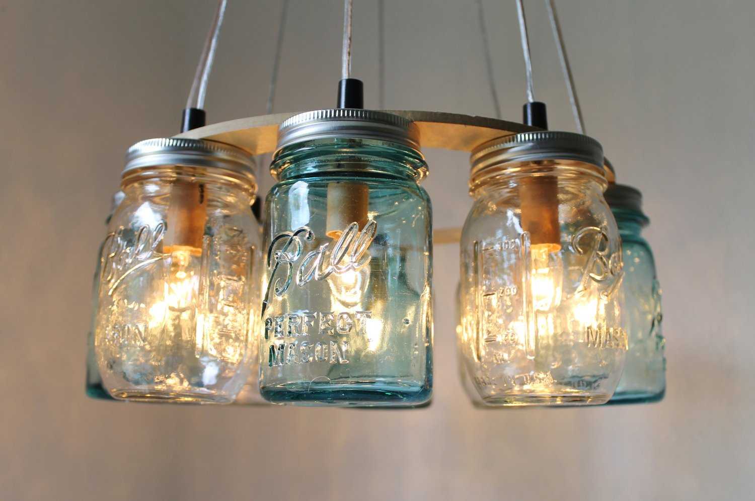 Старым баночкам можно найти новое предназначение. Светильники можно создать с помощью ниток, электропроводов, ручек для банок. Емкости необходимо оборудовать ручками. Их нужно будет обвязать нитками, крепящимися к подготовленному заранее железному каркасу. В банки опускаются электропровода с патронами и лампочками — люстра готова. Можно сделать вариант для дачи — нитки обвязываются вокруг веток дерева, а внутри банок кладутся свечи или маленькие фонарики. Красиво смотрятся емкости, обмотанные разноцветными нитями или украшенные узорчатыми салфетками. Внутреннюю часть банок можно покрасить в белый цвет, и пока она еще не подсохла, нанести рисунок в виде хаотичных линий. Некоторые окрашивают тару с внешней стороны разными красками, а сверху рисуют изображение с помощью глиттерных теней. Банки также можно оклеить мелким стеклобоем.