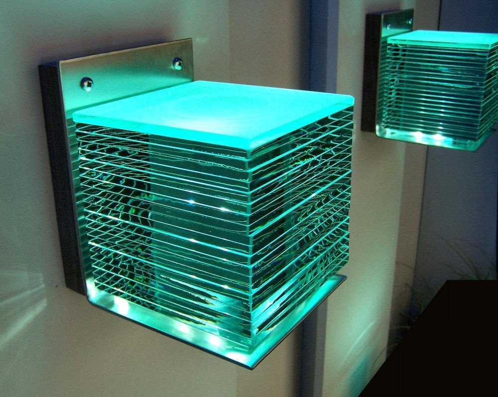 На потолок можно повесить композицию из нескольких пустых бутылок из-под спиртных напитков. Трехлитровые банки можно подвешивать за металлические цепи. Стеклянная посуда тоже подойдет в качестве плафона. Светильник из множества стеклянных фрагментов может имитировать хрустальную люстру. Разбитым стеклянным предметам находят новое предназначение в виде оригинального осветительного прибора. Из бокалов и фужеров создаются прекрасные настольные светильники. Могут пригодиться различные стеклянные коробочки, стекла из старых настенных бра, фар, межкомнатных дверей. Самодельную стеклянную люстру можно разрисовать акварельными или витражными красками. Получатся красивые витражи. Для создания подвесных светильников мастера используют разнообразные декоративные емкости из-под масел и духов. В отличие от дерева и бумаги, стекло имеет высокую пожарную безопасность.